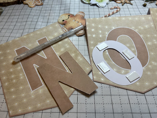 Next, I have added the additional lettering to layer up and added some foam pads to the back for a little dimension. I also edged the letters with my trusty stardust Sakura gelly roll pen to add some twinkle and highlight.